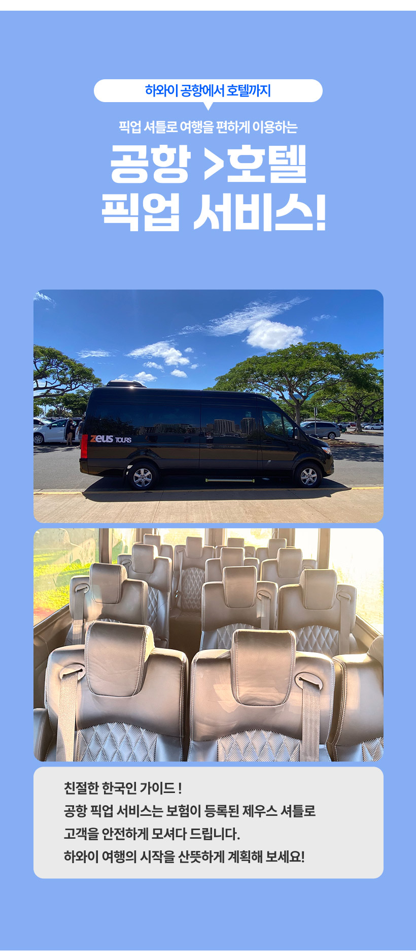 < 수하물 관련 공지사항> ▪1인당 무료 수화물 1개 ▪쇼핑백, 보스턴백, 백팩 등 소형 짐은 탑승 시 발밑에 또는 본인 무릎위에 놓으실수 있습니다. 큰 백팩은 1달러 차지합니다. ▪크기가 작아도 바퀴달린 기내용 케리어는 들고 타실수 없습니다. ▪ 휠체어 1개당 5달러 ▪32인치 이상되는 모든 수화물 1개당 $5 ▪골프클럽 1개당 $3 ▪위탁 수하물 1개당 $2 ▪ 접이용 일반사이즈 유모차 $2 ▪기내용 수하물 1개당 $1 ▪접이용 휴대사이즈 유모차 1개당 $2 *모든 추가 비용은 당일 담당 기사님에게 직접 지불해주시면 됩니다. <포함사항> - 공항 -> 호텔 픽업 교통편 (편도) - 하와이 전문 한인 가이드 <불포함사항> - 여행자보험