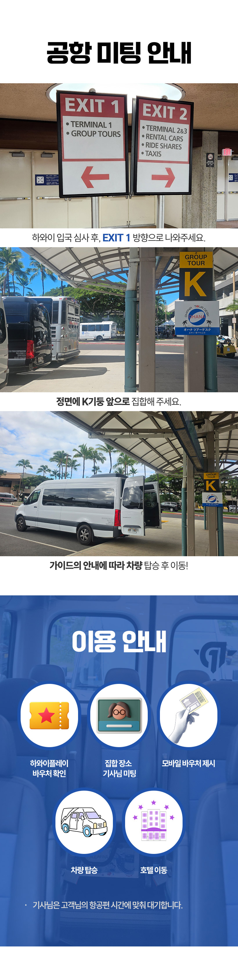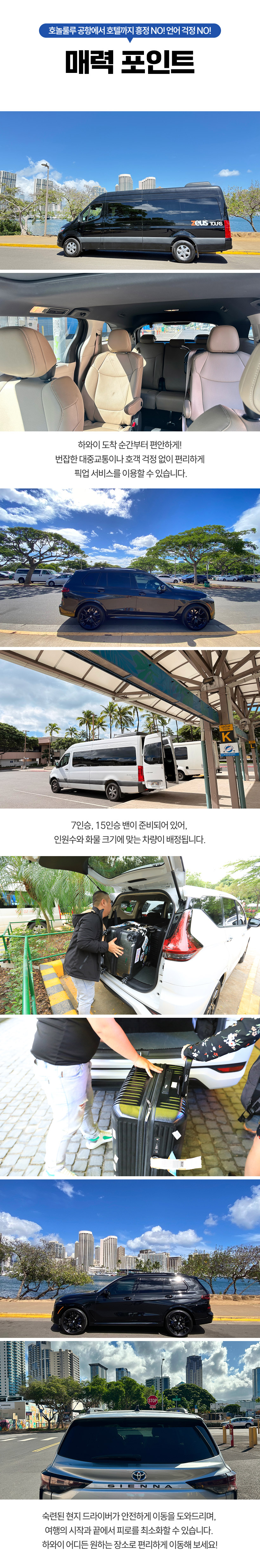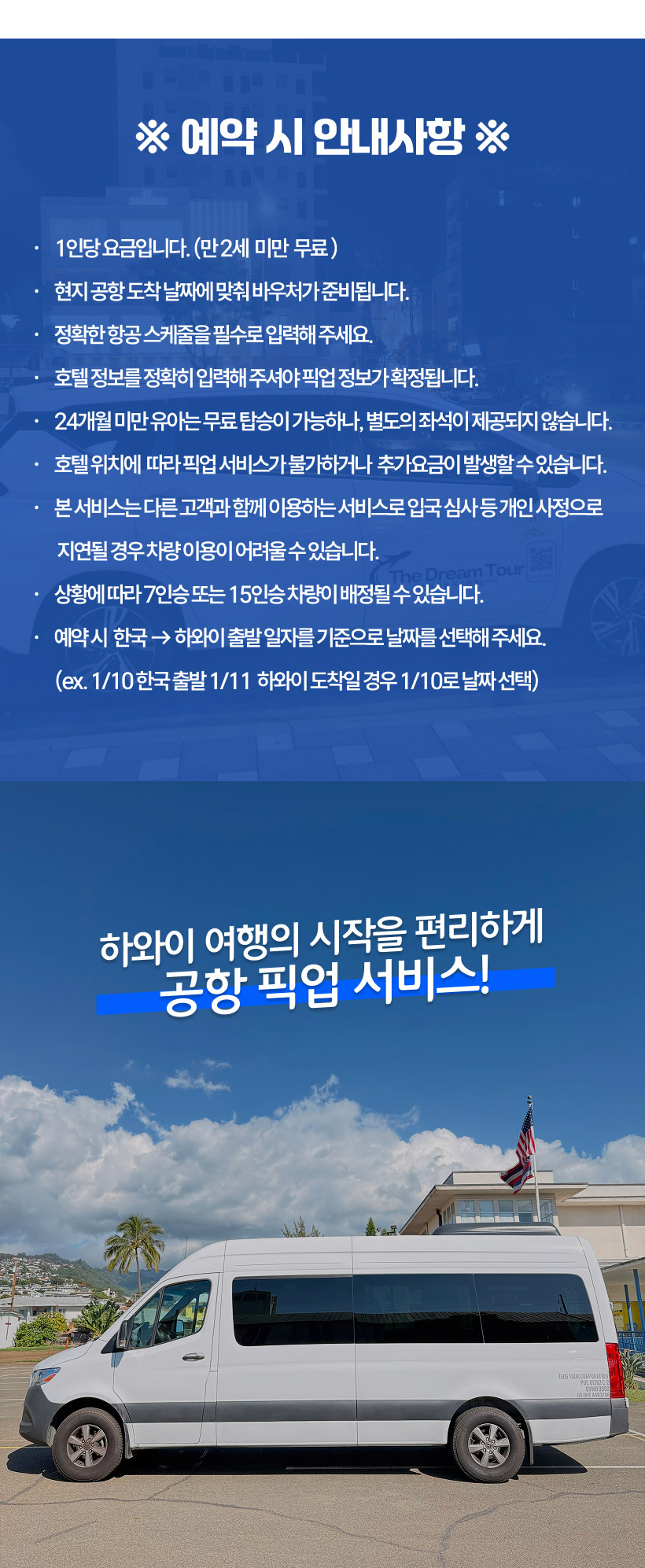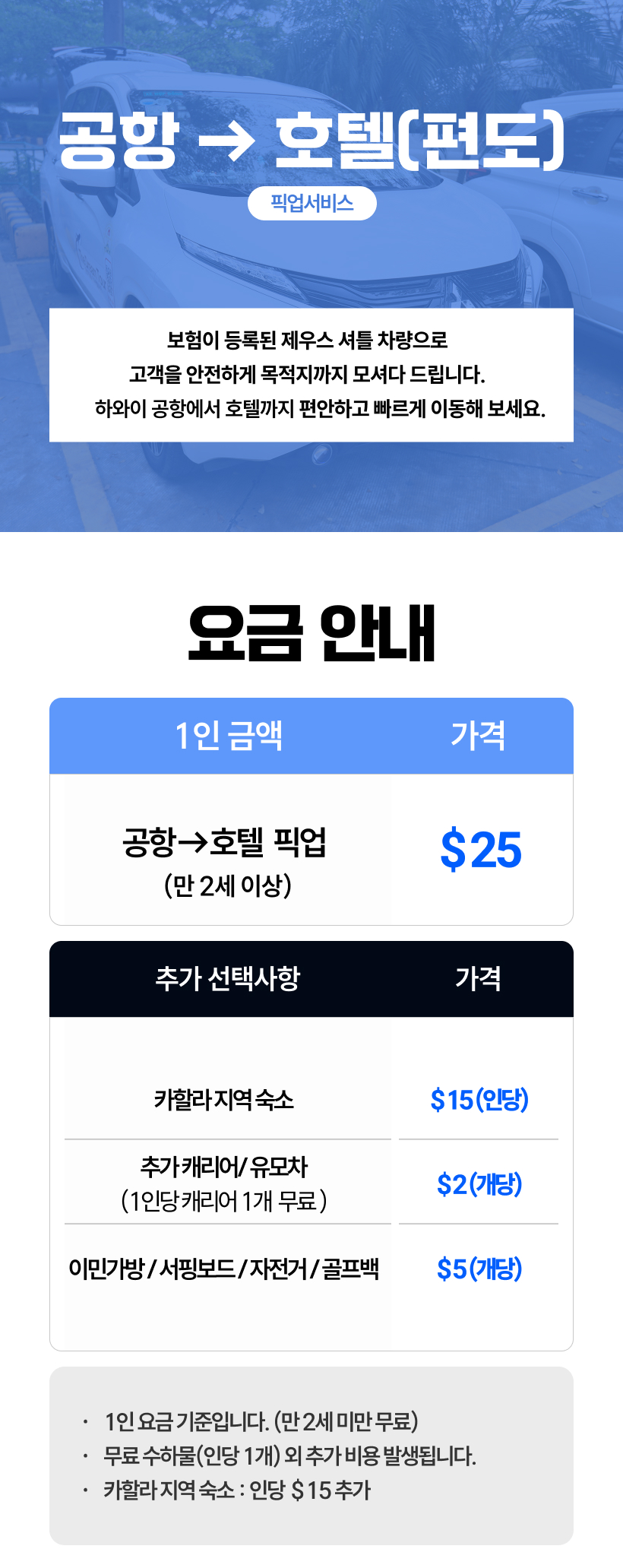 < 수하물 관련 공지사항> ▪1인당 무료 수화물 1개 ▪쇼핑백, 보스턴백, 백팩 등 소형 짐은 탑승 시 발밑에 또는 본인 무릎위에 놓으실수 있습니다. 큰 백팩은 1달러 차지합니다. ▪크기가 작아도 바퀴달린 기내용 케리어는 들고 타실수 없습니다. ▪ 휠체어 1개당 5달러 ▪32인치 이상되는 모든 수화물 1개당 $5 ▪골프클럽 1개당 $3 ▪위탁 수하물 1개당 $2 ▪ 접이용 일반사이즈 유모차 $2 ▪기내용 수하물 1개당 $1 ▪접이용 휴대사이즈 유모차 1개당 $2 *모든 추가 비용은 당일 담당 기사님에게 직접 지불해주시면 됩니다. <포함사항> - 공항 -> 호텔 픽업 교통편 (편도) - 하와이 전문 한인 가이드 <불포함사항> - 여행자보험